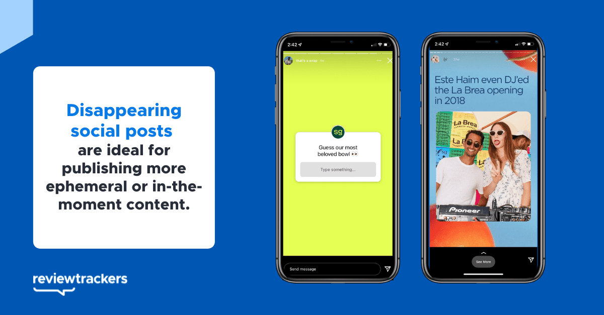 The disappearing video content format — think Snapchat, Instagram Stories, and Facebook Stories — is also becoming increasingly popular. Most of these posts have a 24-hour shelf life or less. This type of social media marketing post is ideal for publishing more ephemeral or in-the-moment content: for example, daily specials, product teasers, highlights from an event, polls, and quick announcements.