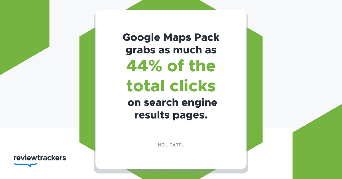 The Google local pack is also displayed above traditional text-only or links-based search results, making it one of the most valuable pieces of online real estate across any platform. According to research, the Google Maps Pack grabs as much as 44% of the total clicks on search engine results pages.