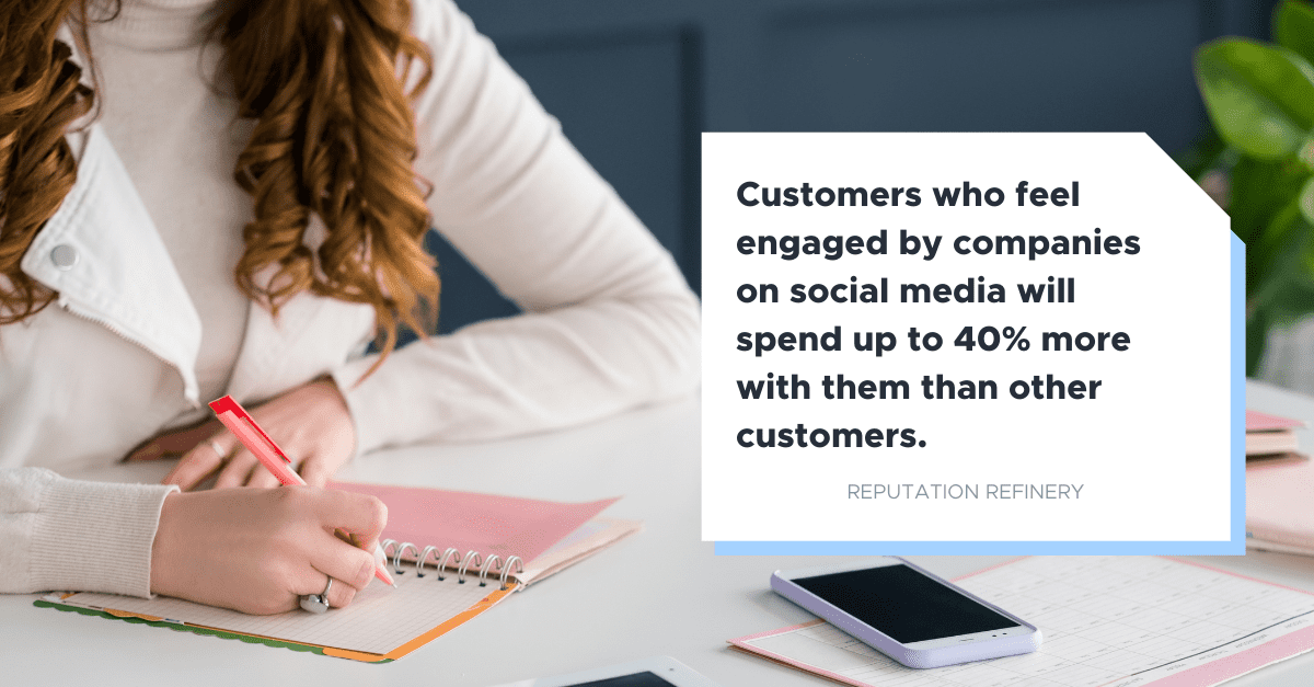 • Customers who feel engaged by companies on social media will spend up to 40% more with them than other customers. (Reputation Refinery)