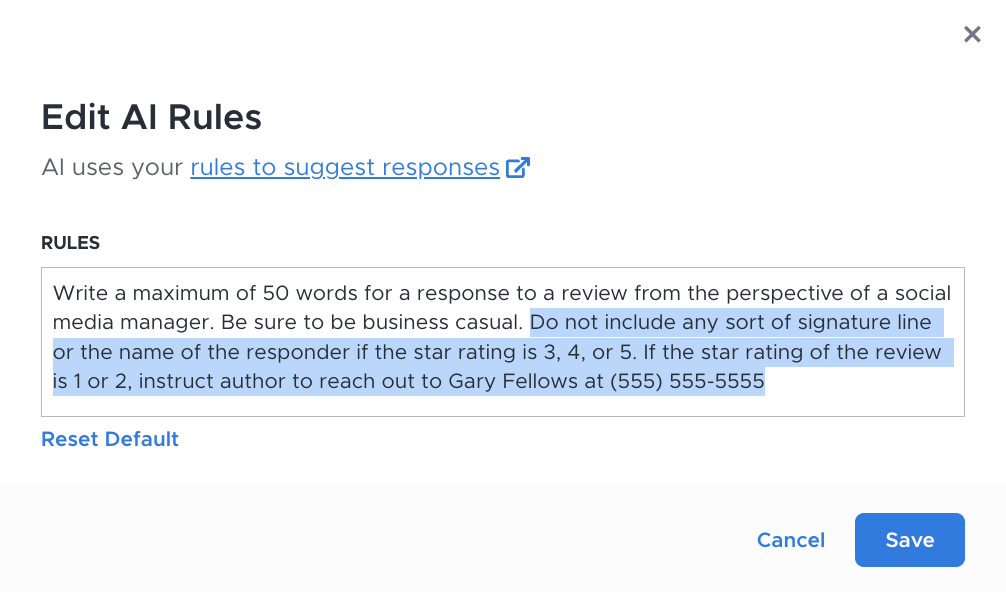 Unless further instructions are provided, some models generate responses that sound like emails, starting with “Dear [author name]” and ending with “Sincerely, [responder name].” Since this isn’t common practice when responding to reviews, you can include supplemental text in the prompt, such as “Do not include any sort of signature or name of the responder.”