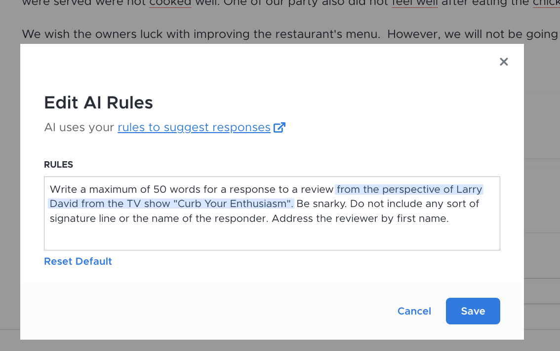In the above example, we instructed the AI model to respond to a review from the perspective of a particular person or persona: Larry David. We also specified the tone of the response as well as the maximum length, and added some corrective details about formatting based on the model’s tendencies. These are the most commonly used instructions when creating prompts for how to respond to negative reviews as well as positive feedback.
