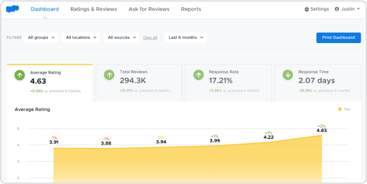 These tactics help brands serve the valuable social proof consumers need to not just make a purchase decision but also to become a loyal and happy customer. In its first year, the average overall rating of ReviewTrackers’ customers was 3.71 stars. Ten years later, that overall average rating has increased to 4.27 stars, and customers continue to praise the ReviewTrackers platform.
