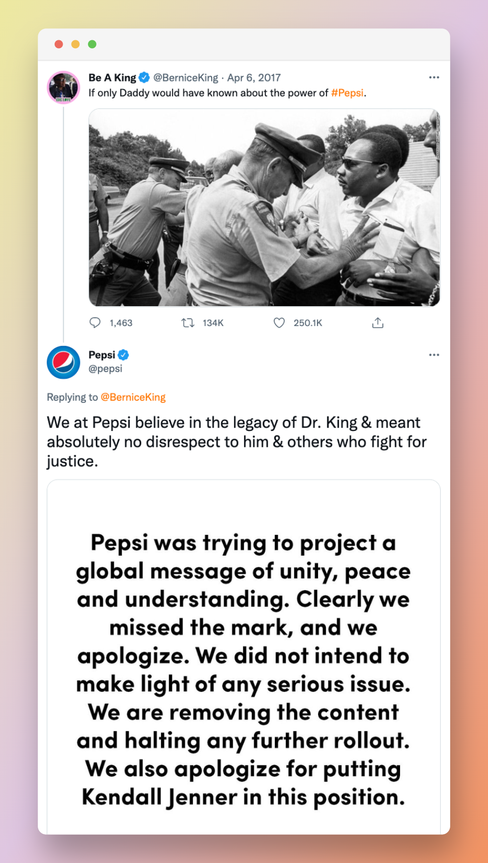 “Pepsi was trying to project a global message of unity, peace, and understanding,” read one of the company’s tweets. Clearly, we missed the mark and we apologize. We also apologize for putting Kendall Jenner in this position.”
