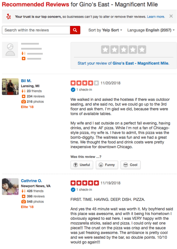That same system is also in charge of dictating which reviews show up on a listing’s “Recommended” reviews section, which is updated on a daily basis. Factors that determine if a review is “Recommended” includes its overall quality, reliability, and the user’s overall activity. According to Yelp, 72 percent of all reviews on the site are “Recommended.