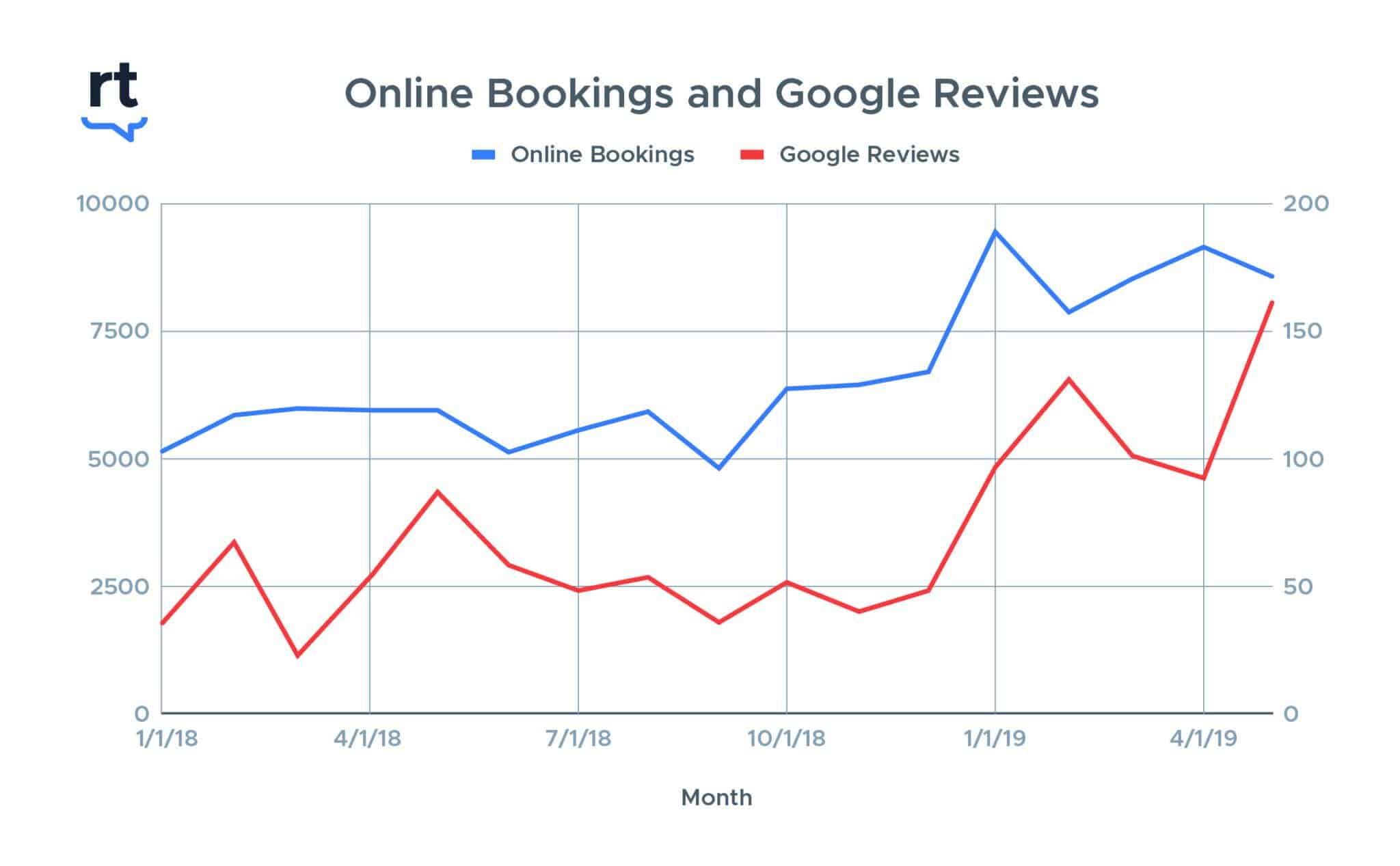 The impact of Google reviews is also evident. The company’s website analytics show a positive correlation between the number of reviews on Google and number of search impressions, profile views, phone calls and website clicks, and on-site conversions (web appointments).