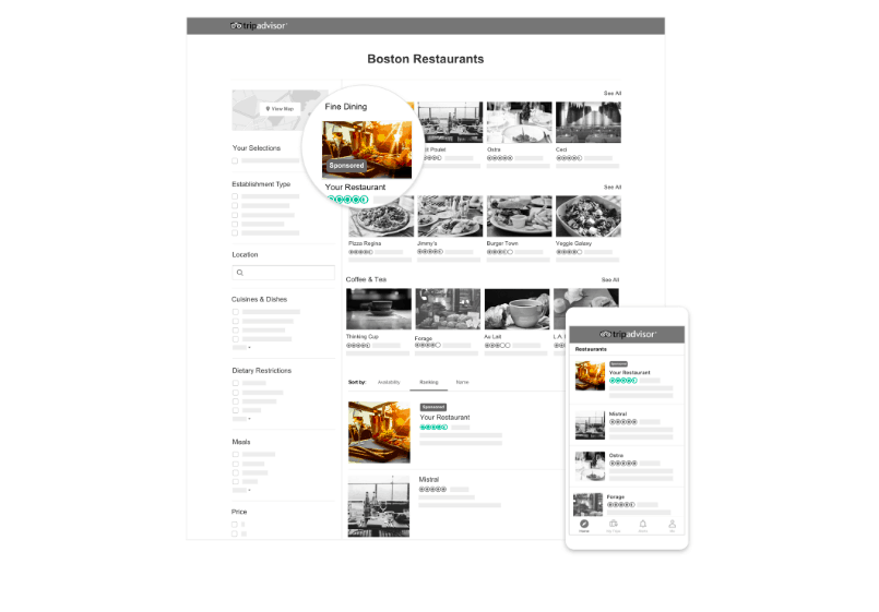 Tripadvisor Ads for restaurants drive traffic to your listing by promoting your restaurant in exclusive sponsored placements. These go to a targeted audience of diners looking for a place to eat in your given location.