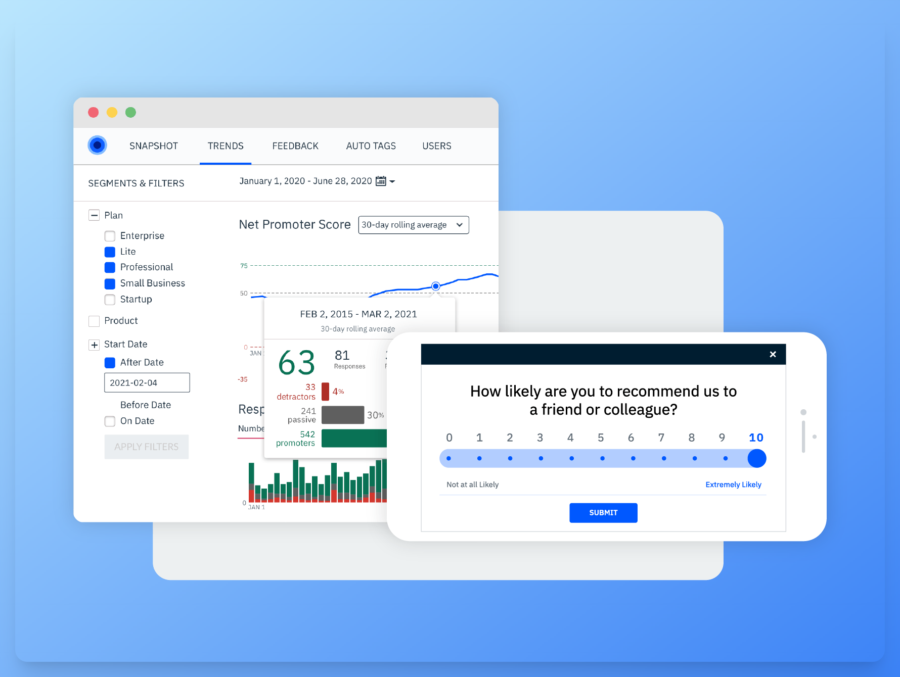 You can track all feedback using a single dashboard for easy viewing and comparison. You can also automate marketing emails or internal notifications to trigger after feedback responses are received.