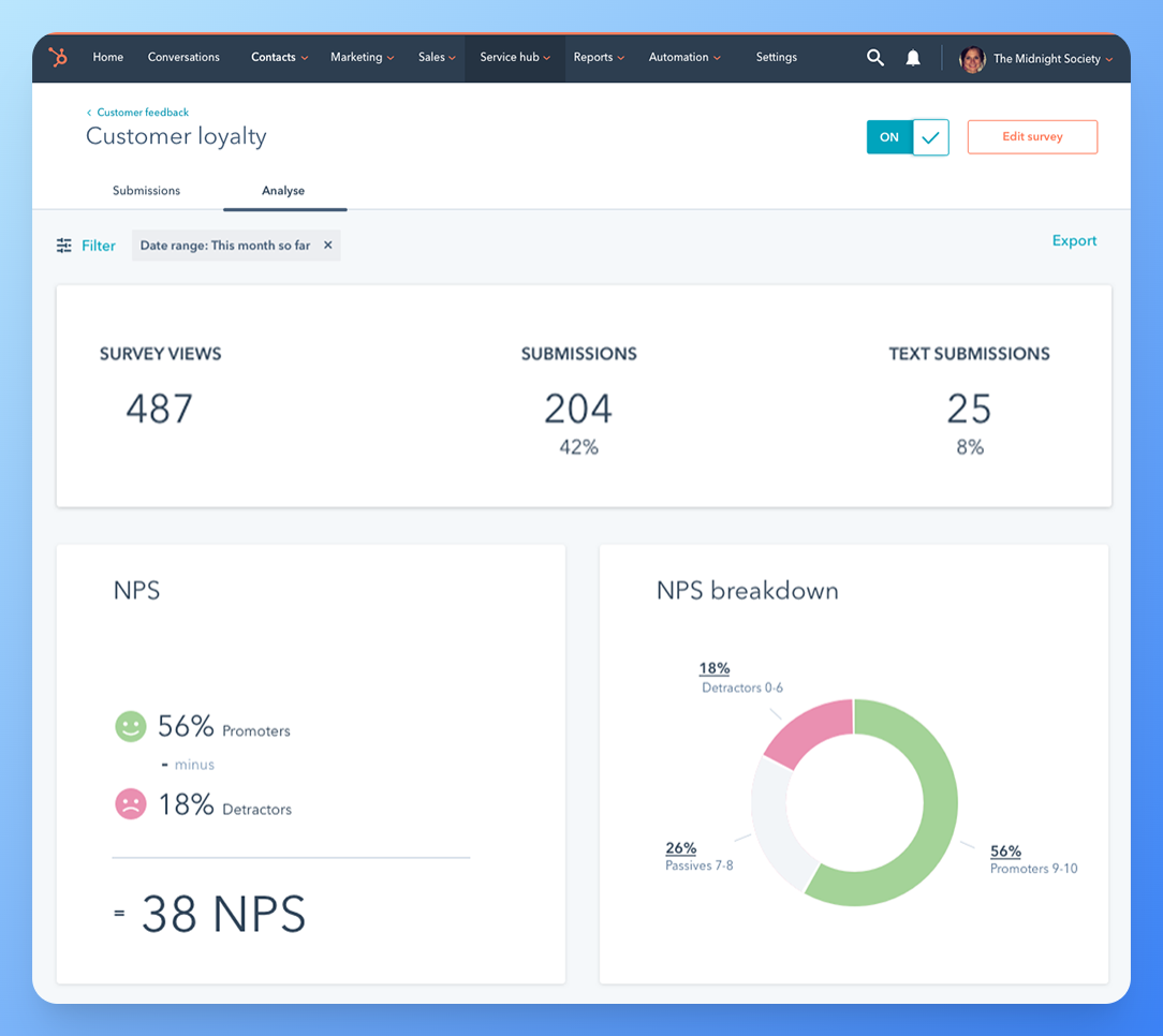 Popular marketing software solution HubSpot also offers a customer feedback software tool that makes it easy for users to create various types of customer satisfaction surveys and customer experience surveys, such as NPS, CSAT, and CES.