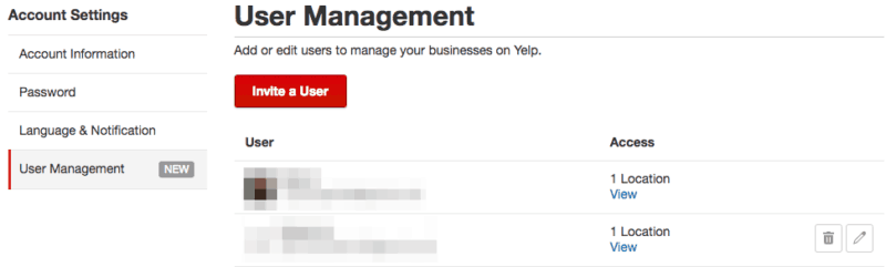 - Go to the “Account Settings” tab in the Yelp for Business Owners site and click on the “User Management” section on the left-hand menu.