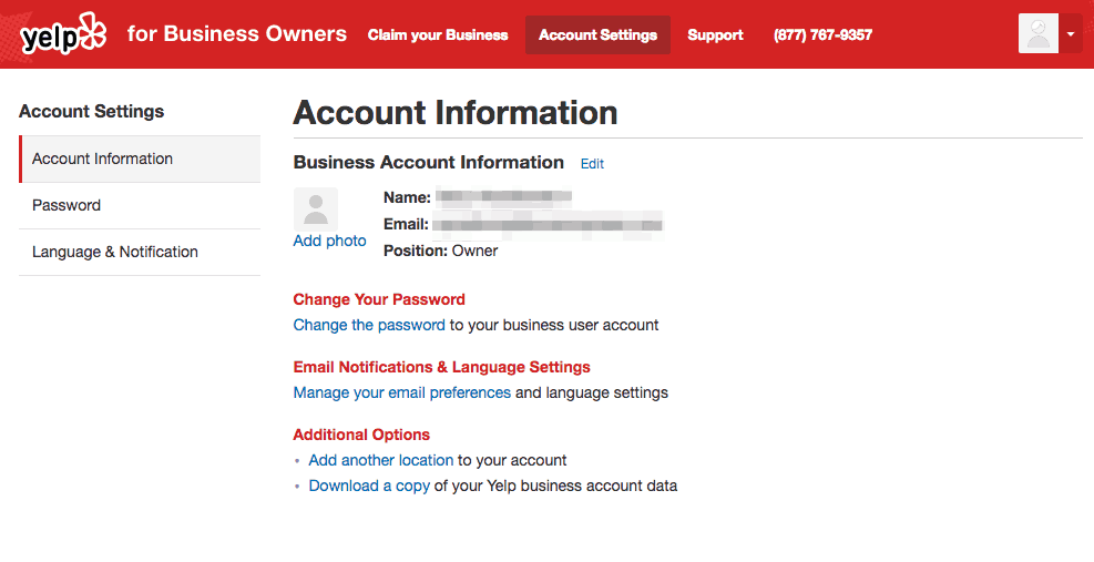 - Go to the “Account Settings” tab at the top of the Yelp for Business Owners page and click on the “Account Information” section.