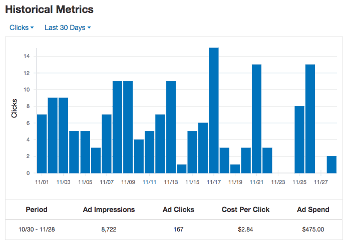 You’ll also a larger picture of the ad’s performance in the “Historical Metrics” chart. You can see data on overall clicks and impressions over the last last 30 days, the current month, the previous month, the last 12 months, or for the current year.