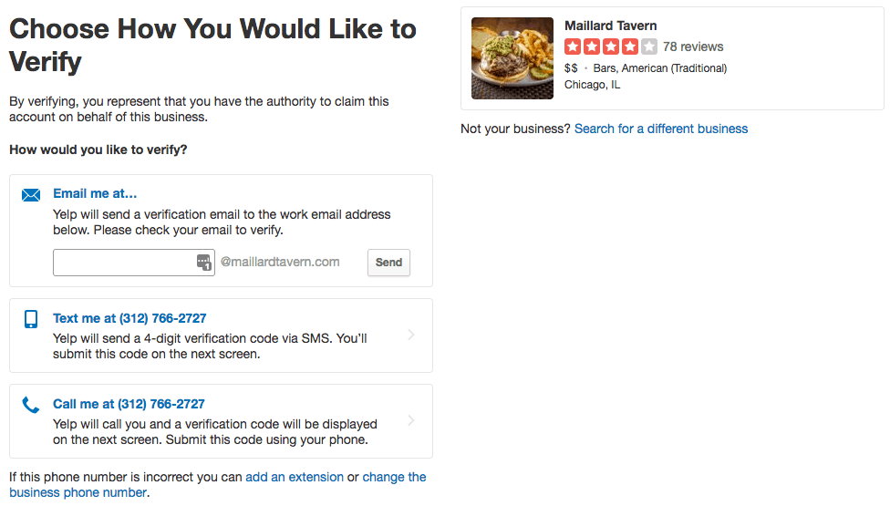 - You’ll need to verify that you are authorized to claim the listing for the business. You can tell Yelp to send you a verification message at a work email address, send a four-digit verification code to the business phone number, or call that same number with the code.