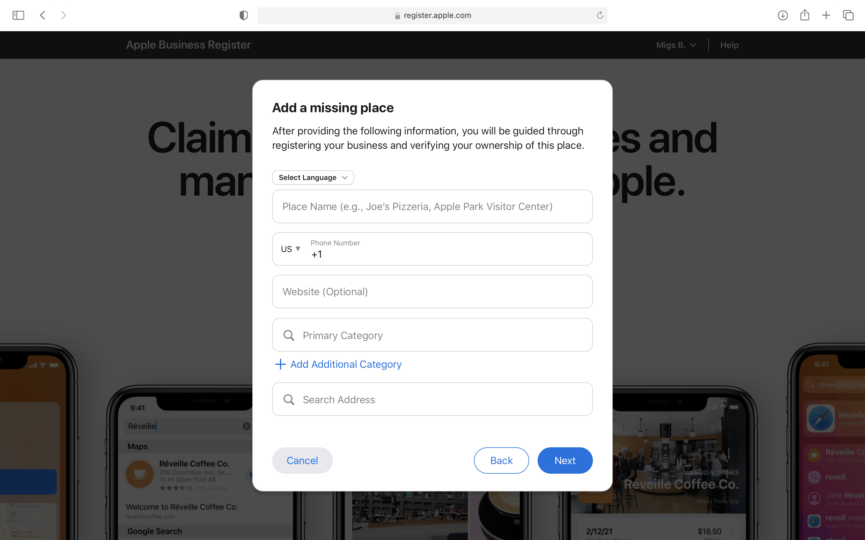 2. If you’re creating a new listing or adding a missing place, you have to fill out a form that requires your business place name, phone number, website, business category, and address. After providing the following information, you will be guided through registering your business and verifying your ownership of this place.