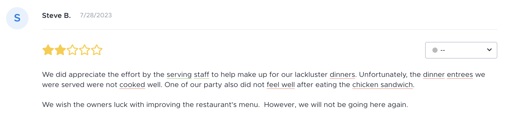Here is where generative AI gets really cool. Prior to the availability of this technology, most businesses would spend a great deal of time crafting response templates for reviews based on star ratings. That’s because positive, negative, and even neutral reviews warrant fundamentally different treatment.