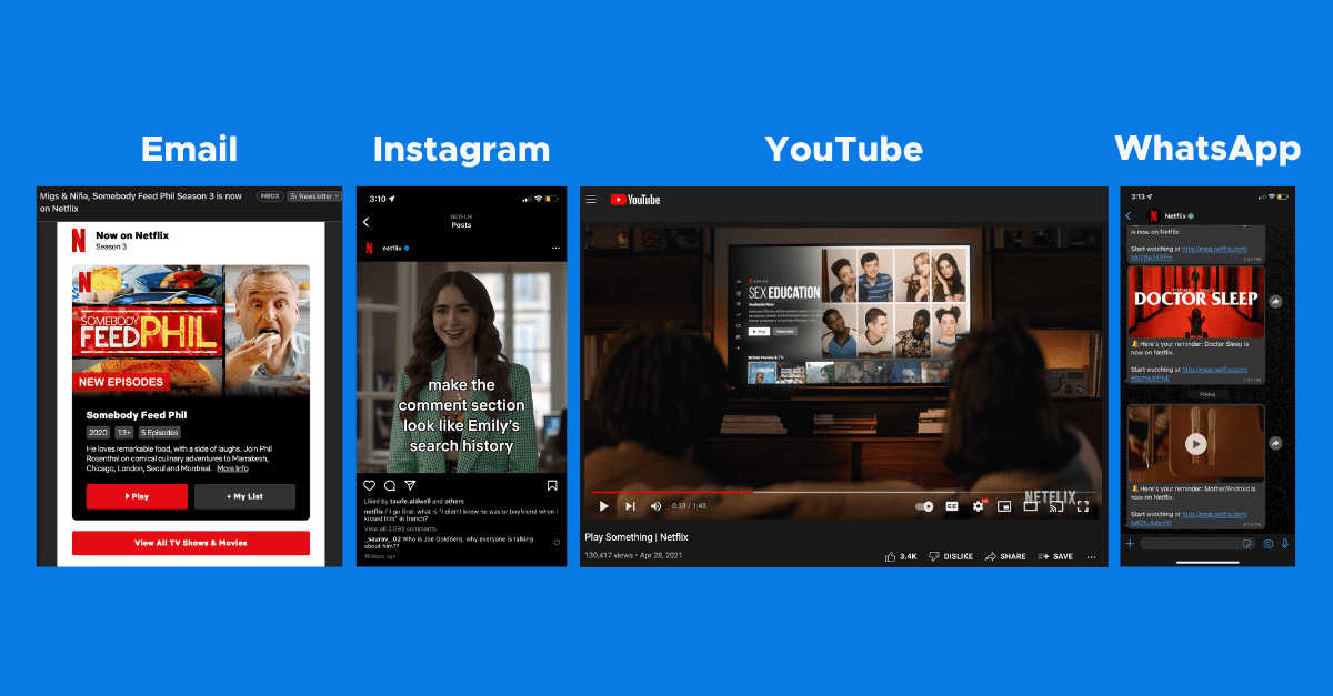 - On YouTube, Netflix publishes trailers of its movies and shows. The company also uploads videos to encourage product adoption and advertise new service features and announcements, such as the “Play Something” feature.