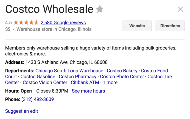Costco takes this approach to the extreme — listing its gas station, bakery, food court, tire center, and a number of other departments all separately. For businesses like this that have one main location, but two distinct operations that are different enough to warrant multiple categories you may be able to add them as separate locations. What qualifies for a multi-department listing? Think about banks inside grocery stores. Or restaurants inside gas stations. Google’s guidelines say that if your departments have separate entrances and / or separate customer care, you may qualify for multiple listings.