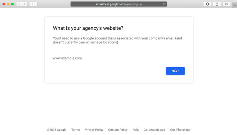 To start the agency registration process navigate to https://business.google.com/agencysignup and enter your agency website URL. You’ll also need to use a Google account that’s associated with your company’s email (and doesn’t currently own or manage locations).